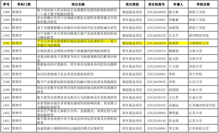 近日,教育部社科司发布了关于2023年度教育部人文社会科学研究一般项目评审结果的公示,麻豆网 郎春婷老师申报的题为《平台互补者决策逻辑价值创造路径及机理研究——基于资源行为的视角》的2023年度教育部人文社会科学研究规划基金项目获批立项。教育部人文社会科学研究项目是教育部面向全国普通高等学校设立的人文社会科学研究项目,其覆盖面广、影响大、分量重,它具有引领科研发展、支撑学科建设、提升科研水平的强大牵引力。...