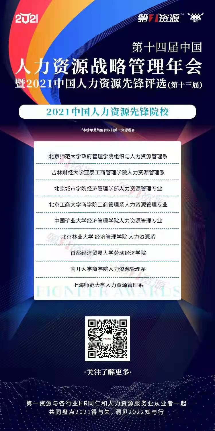 2021年12月2日,在中国领先的人力资源第三方媒体和产业服务平台第一资源主办的“扬鞭奋进·志在巅峰”2021中国人力资源战略管理年会(第十四届)暨2021中国人力资源先锋评选(第十三届)活动中,全国共有9所院校获评为“2021中国人力资源先锋院校”,麻豆网 人力资源管理专业位列其中。
