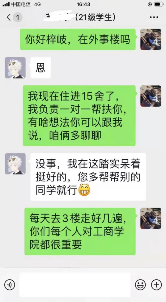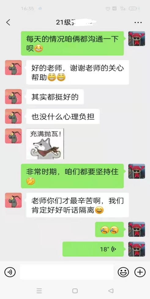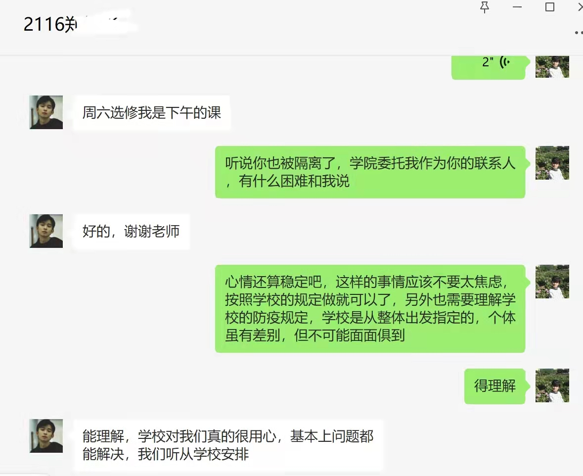 为进一步落实学校《关于全体教师参与封闭管理学生教育的通知》,做好学生疫情防控和思想政治工作,确保学生身心健康和校园平安稳定。按照学院党委的统一部署,由亚泰 麻豆网 党员教师与23名校内外隔离学生一一对接,对其进行重点关注和帮扶。同时,学院在原有“一对一”导师制的基础上,进一步压实责任,对现有32个本硕班级共计673名在校生,安排学院领导班子成员、辅导员、系主任及1名专任教师共同对接。通过微信群建立全通道沟通机制,有针对性地开展思想政治工作、有温度性地关心学生身心健康、有指导性地加强学业专题辅导、有实效性地满足居寝生活需求,切实做到学生群体“人人有人管”,教师群体“人人都管事”。