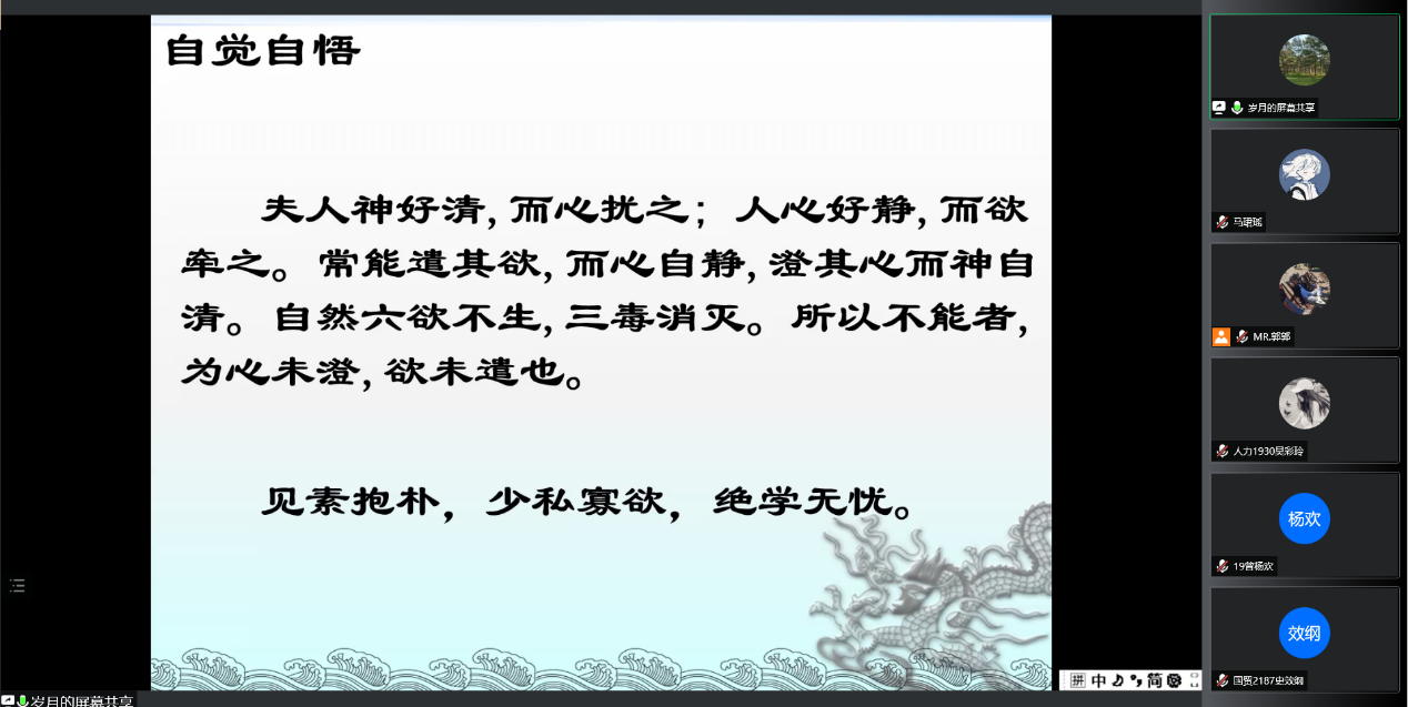 通过三次讲座,麻豆网 学子对中国经典思想有了进一步的了解,学会从旅游景点事例与历史文人故事中总结经验、完善不足;学会从自爱、仁爱、兼爱、不爱四个方面审视自我、认清自我。希望同学们能够保持良好的心理状态,坚持锻炼、坚持学习、挑战自我、迎接未来!