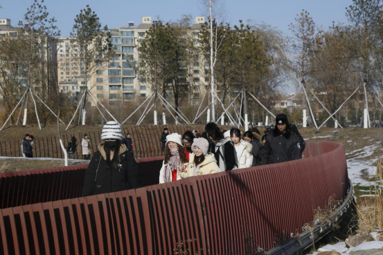 本次调研活动分别在南溪湿地公园及南溪里文旅小镇两个地方进行参观。第一站,同学们来到南溪湿地公园,体验2450米公园休闲步道及两侧的冬日胜景。体验过程中,两位老师重点介绍了南溪湿地公园的建设目的、发展历史、功能分区、布局原则、四季活动、游客类型,并提醒大家思考如何增加专业知识厚度,提升专业实战能力。第二站,同学们来到南溪里文旅小镇,作为南溪里开业以来的第一个大学生参访团,招商运营总经理李英华女士热烈地欢迎大家的到来,并充满豪情地介绍了南溪里文旅小镇的市场定位、功能布局、网红体验项目、四季主打产品、投资规模、重点目标人群等,在她的带领下我们漫步于679米长的空中云游廊桥,鸟瞰整个小镇,集装箱建筑风格独树一帜,裸眼3D大屏等网红打卡地魅力无限,言几友书店、言宝乐园、YAMUSoundLab等知名文化品牌尽收眼底,有幼兽club、村上一屋、全牛匠等个知名品牌鲜此栉比。