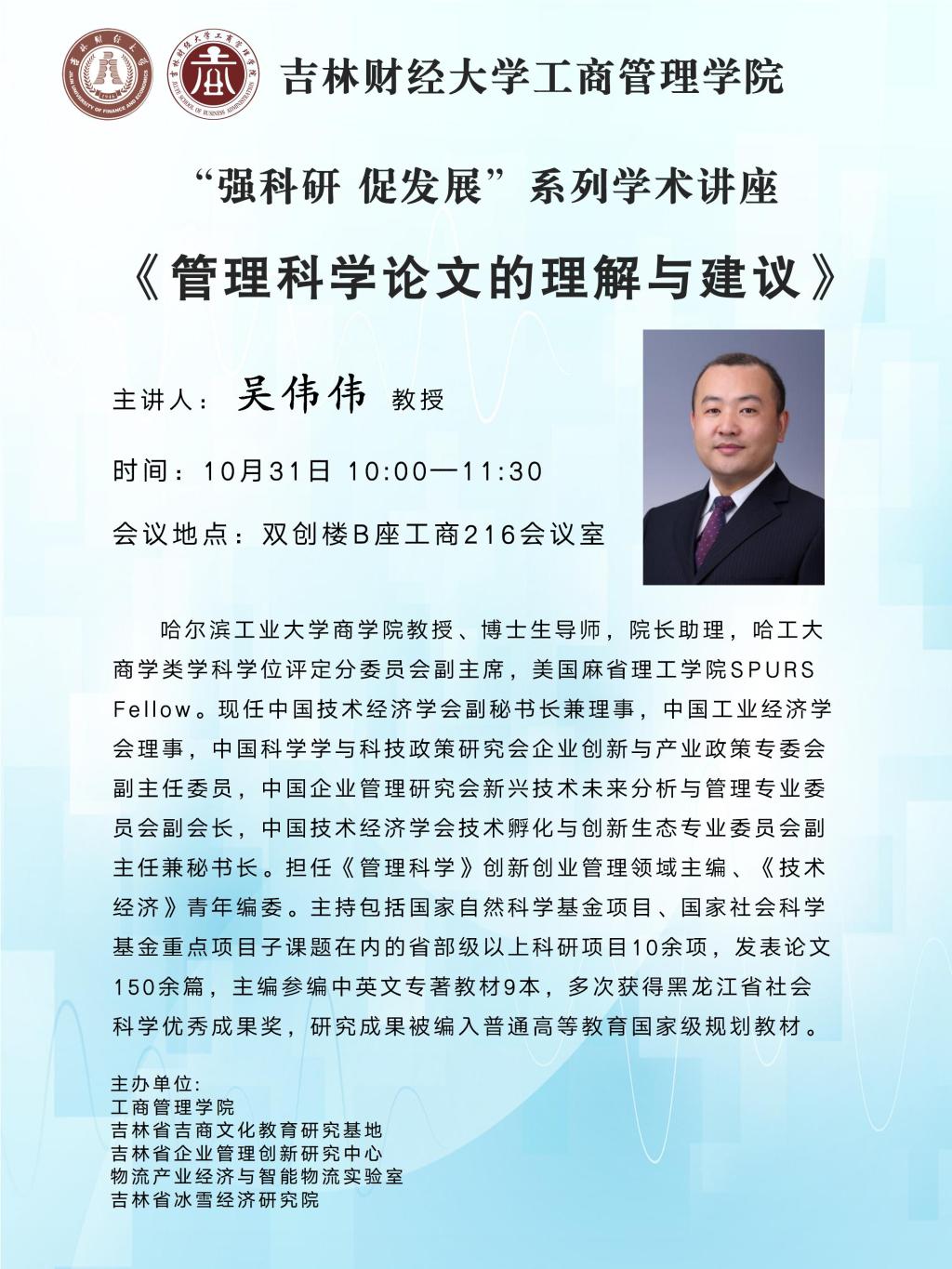 吴伟伟,哈尔滨工业大学商学院教授、博士生导师,院长助理,哈工大商学类学科学位评定分委员会副主席,美国麻省理工学院SPURS Fellow。现任中国技术经济学会副秘书长兼理事,中国工业经济学会理事,中国科学学与科技政策研究会企业创新与产业政策专委会副主任委员,中国企业管理研究会新兴技术未来分析与管理专业委员会副会长,中国技术经济学会技术孵化与创新生态专业委员会副主任兼秘书长。担任《管理科学》创新创业管理领域主编、《技术经济》青年编委。主持包括国家自然科学基金项目、国家社会科学基金重点项目子课题在内的省部级以上科研项目10余项,发表论文150余篇,主编参编中英文专著教材9本,多次获得黑龙江省社会科学优秀成果奖,研究成果被编入普通高等教育国家级规划教材。