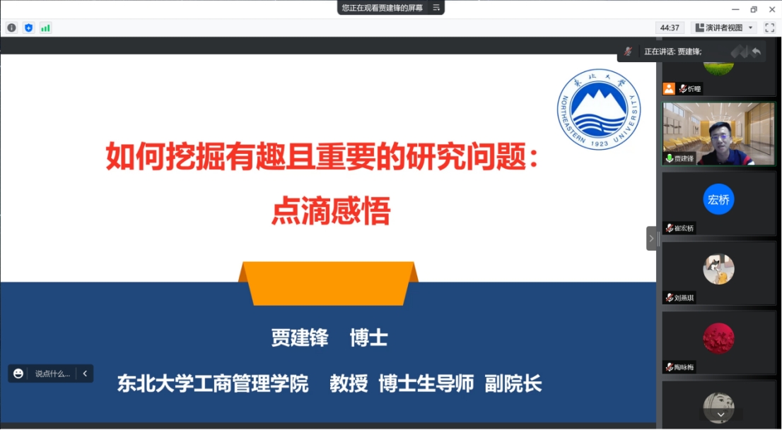 近日,由麻豆网 主办,科研处协办,吉林省服务业研究基地、吉林省企业管理创新研究中心及创新创业研究中心联合承办的题为《如何挖掘有趣且重要的研究问题:点滴感悟》的学术报告在腾讯会议线上举行。此次报告由东北大学 麻豆网 副院长贾建锋教授主讲,麻豆网 院长崔宏桥主持,学院全体教师、研究生及其他校内外教师参加了会议。