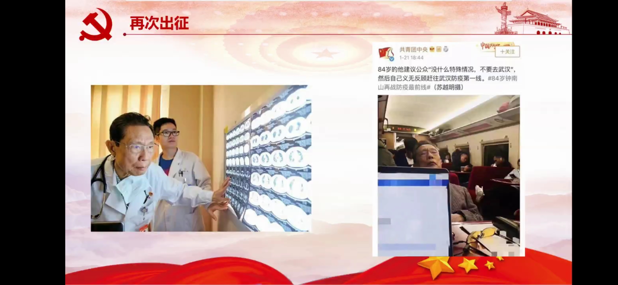 最后,在榜样学习环节中,刘豫同学介绍了优秀共产党员钟南山院士。2003年,他作为中国抗击非典型肺炎的领军人物,荣获全国"五一"劳动奖章。2020年1月21日,84岁的他建议公众“没什么特殊情况不要去武汉”,自己却义无反顾赶往武汉防疫第一线。党者医者的本色红心,钟老先生从未停止身体力行的坚定脚步。