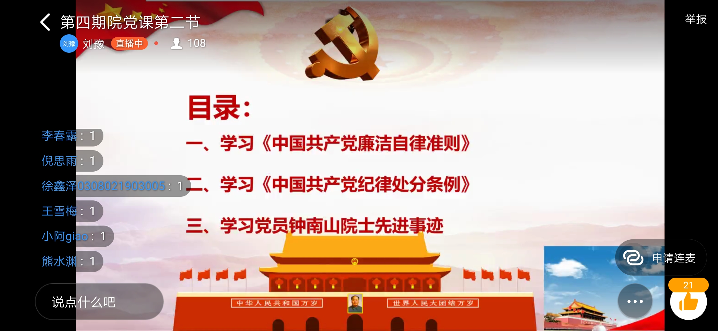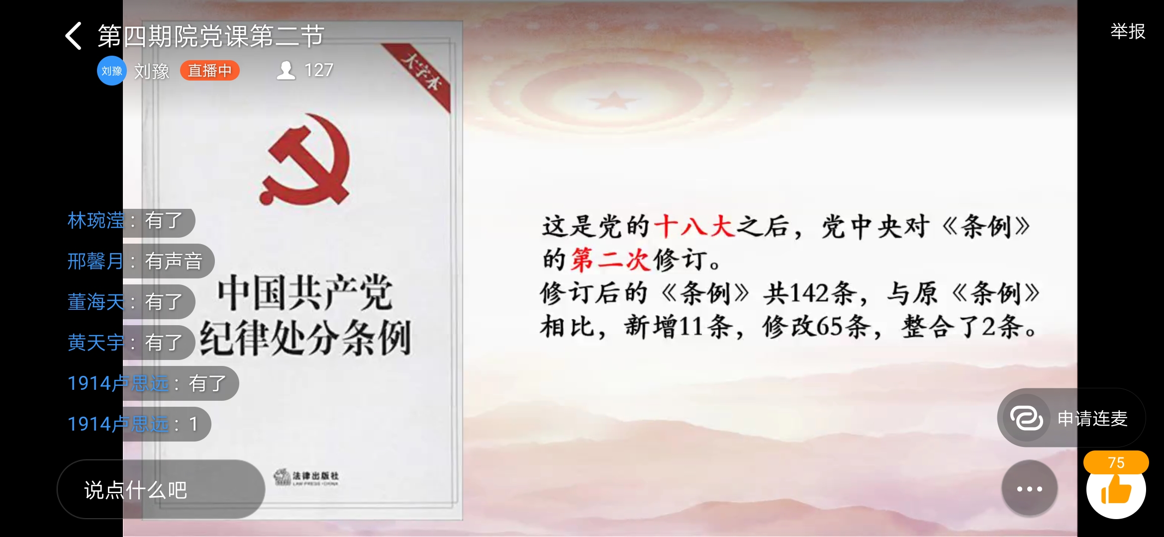 首先,刘豫同学介绍本次党课培训的内容是学习《中国共产党廉洁自律准则》、《中国共产党纪律处分条例》和钟南山院士先进事迹。在学习《中国共产党廉洁自律准则》中,介绍了公与私的关系,即公私分明、先公后私、克己奉公从而达到大公无私的境界,这对加强党内监督、永葆党的先进性和纯洁性具有十分重要的意义。随后,在学习《中国共产党纪律处分条例》中,介绍了三部分内容:(一)指导思想、原则和适用范围;(二)违纪与纪律处分;(三)对违法犯罪党员的纪律处分。并从“咬定目标,毫不松懈”、“理清思路,把握重点”、“强化措施,把握方法”三方面讲解了如何贯彻落实新条例精神。