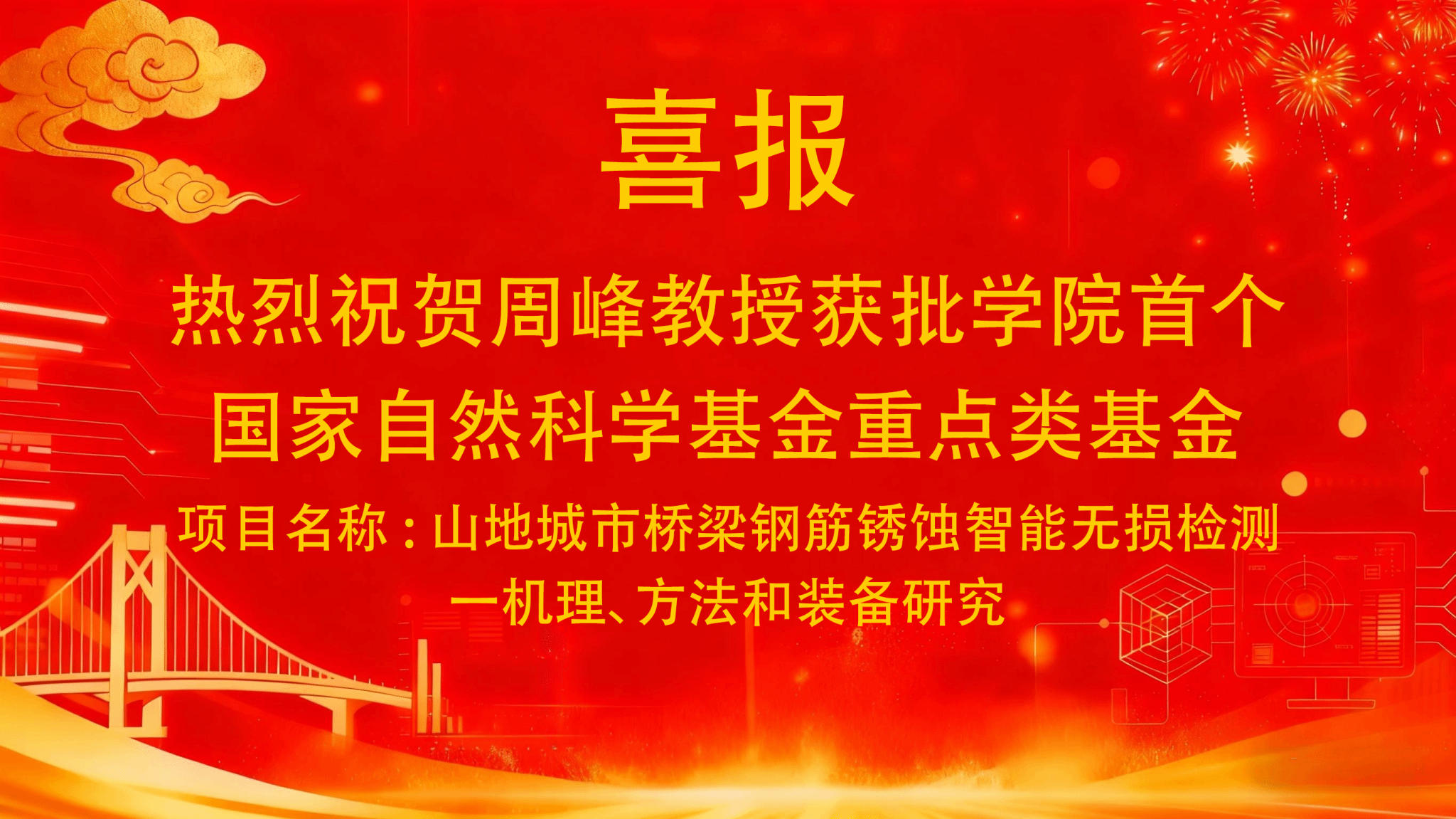 查看详情近日,国家自然科学基金委员会正式公布2025年度国家自然科学基金区域创新发展联合基金重点支持项目评审结果。我院周峰老师申报的“山地城市桥梁钢筋锈蚀智能无损检测--机理、方法和装备研究”项目成功获批立项,获批直接经费达255万元。这一成果不仅实现了我院在国…