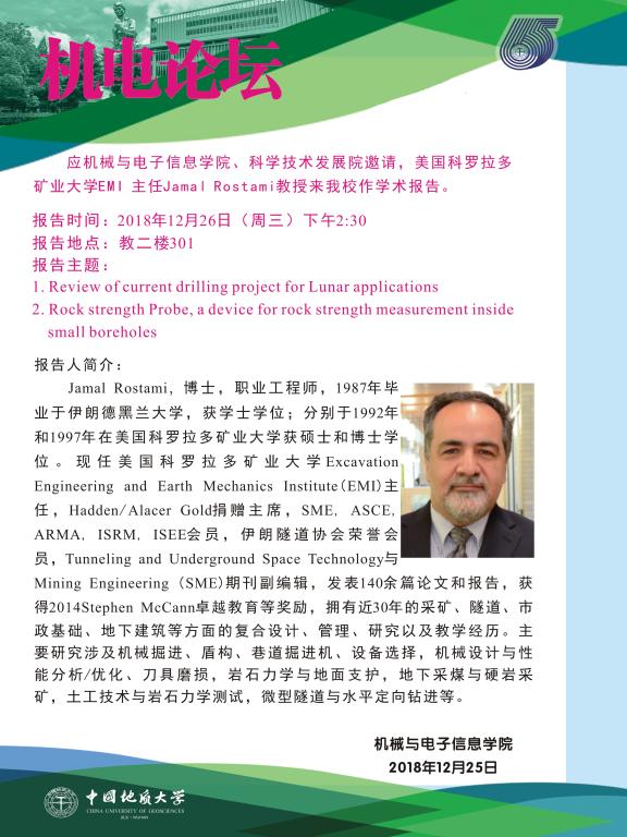 机电论坛:美国科罗拉多矿业大学Jamal Rostami教授来我院作报告