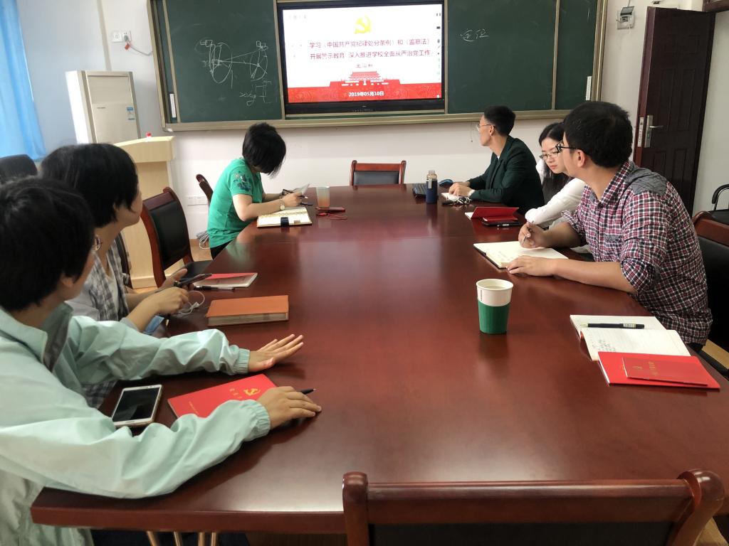 5月30日,机械与电子信息学院各党支部组织党员开展主题党日活动,学习《中国共产党纪律处分条例》、《中华人民共和国监察法》、《湖北高校”支部建设年”方案》、《湖北高校党支部规范化建设试点工作方案》、《党政领导干部选拔任用工作条例》,同时学习了习近平总书记在纪念五四运动100周年大会上的讲话精神,并展开了热烈讨论。