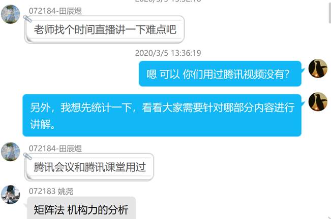 随着教学的开展,少部分同学的反应,自行观看MOOC存在疑难问题没有解决,有点跟不上MOOC视频讲解进度,希望采取直播教学的形式。因此,通过与各班同学沟通,分别采取了腾讯会议视频直播和钉钉群视频直播的形式,对大多数同学都存在的疑难问题——机构运动分析和动态静力分析的矩阵法和进行了专门的直播讲解。直播的时候与同学现场沟通,实时回答同学的疑问,保证了教学质量。