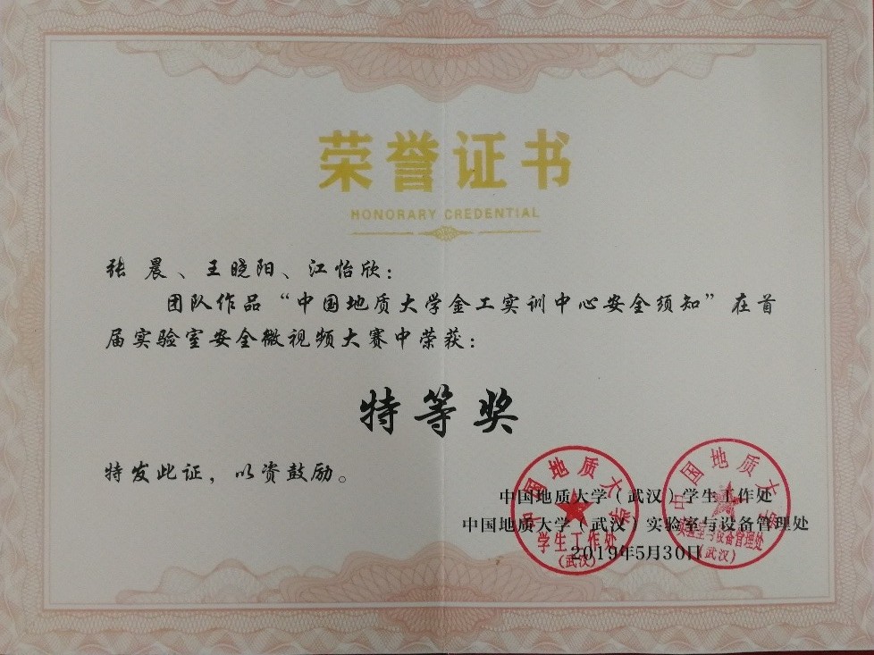 经过全院师生的共同努力和协助下,实验中心师生组织拍摄的“中国地质大学金工实习训练中心安全须知”微视频在学校实验室安全微视频比赛中表现突出,受到全校师生高度好评,一举获得学校特设的“实验室安全微视频比赛特等奖”。