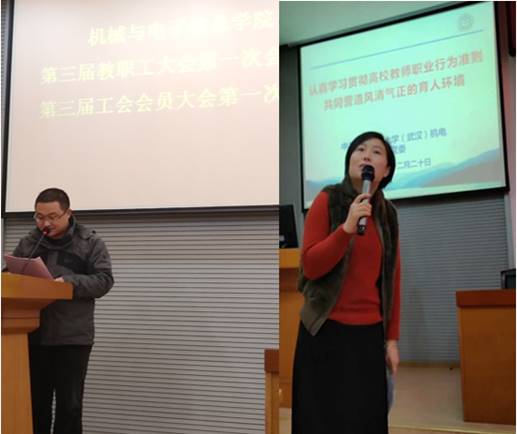 (机电学院工会高翟)2018年12月20日下午,机械与电子信息学院(以下简称机电学院)第三届教职工大会第一次会议暨第三届工会会员大会第一次会议在教二楼301会堂隆重召开。校工会于荣萍副主席及机电学院全体教职工与会,会议由机电学院党委副书记于晓舟同志主持。