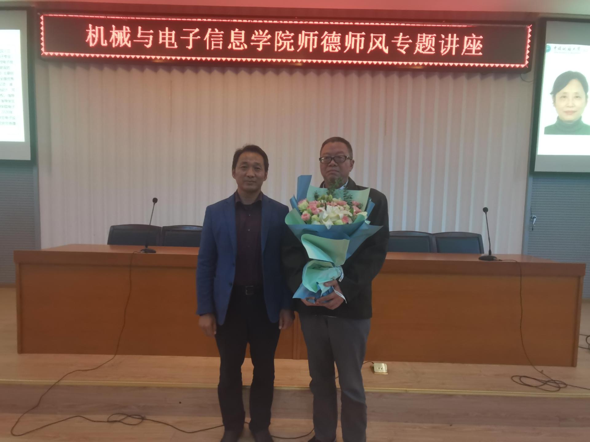 第三个部分孟教授结合自己的亲身体验讲述了武汉抗疫的故事。在疫情期间,孟教授多次看着新闻报道动容落泪,他深刻感受到了国家力量。他认为我国抗疫成功还有一条重要经验就是中央派指导组进驻武汉,协调全国物资调配,与武汉人民感同身受。孟大维教授呼吁全体教师,志存高远,脚踏实地,承担起教师的使命与担当,把个人奋斗与国家发展紧密联系起来,时刻做好准备等待祖国的召唤,为中华之崛起而努力奋斗!最后,李波副院长代表全院教师向孟教授献花致敬并合影留念。