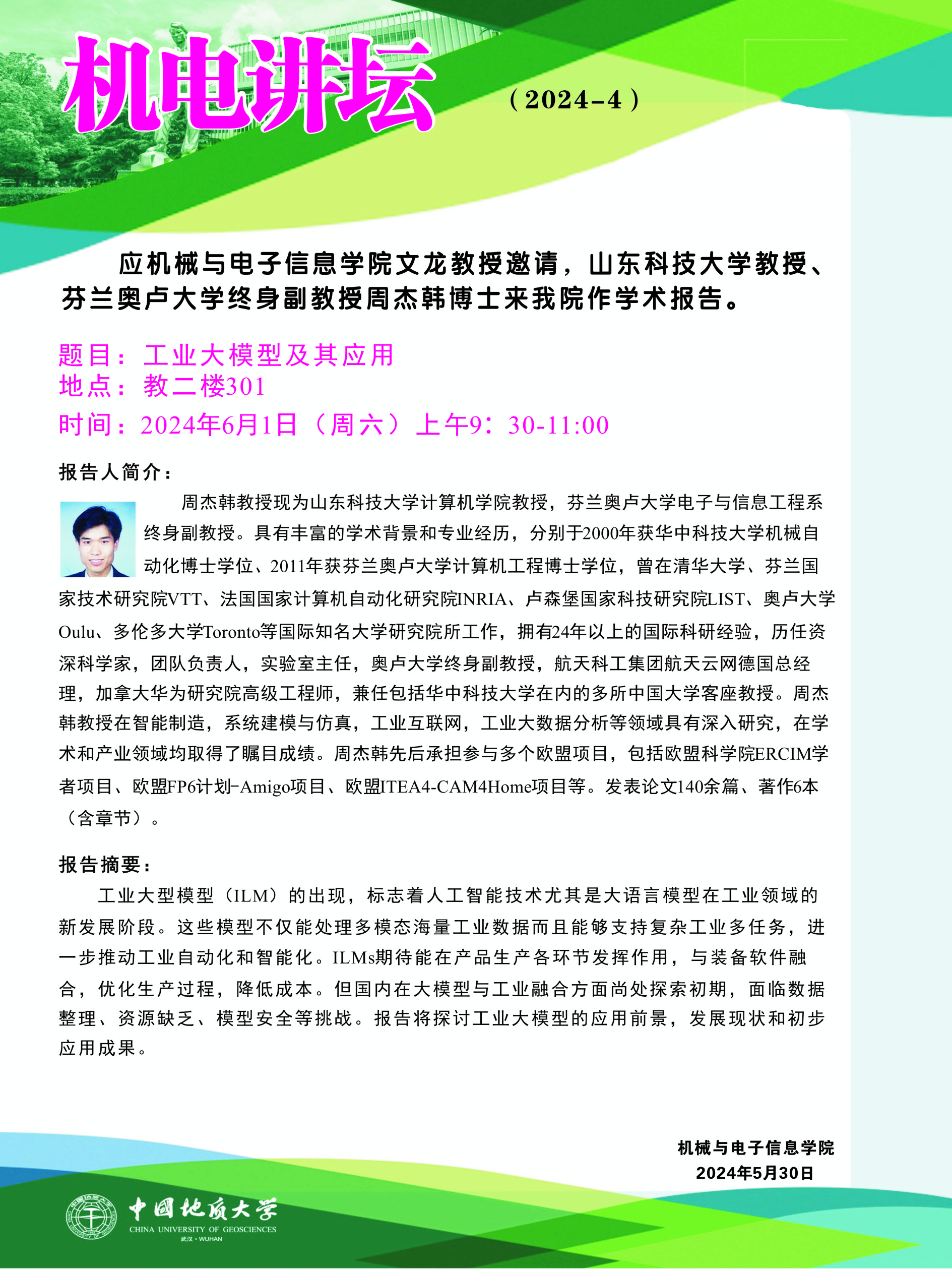 【6月1日】机电讲坛(2024-4):山东科技大学教授、芬兰奥卢大学终身副教授周杰韩博士来我院作学术报告会