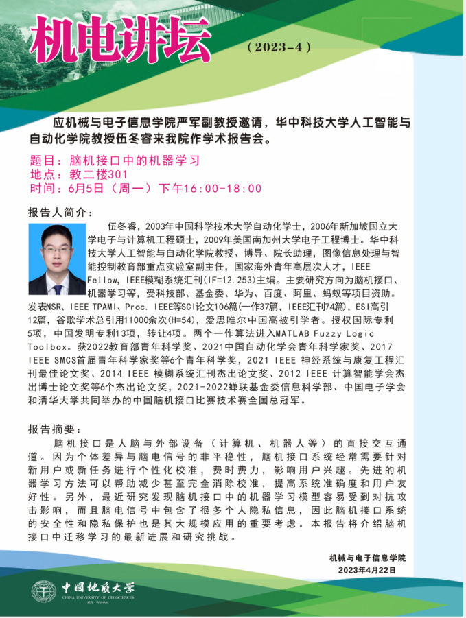 【6月5日】机电讲坛(2023-4:华中科技大学人工智能与自动化学院教授伍冬睿来我院作学术报告会