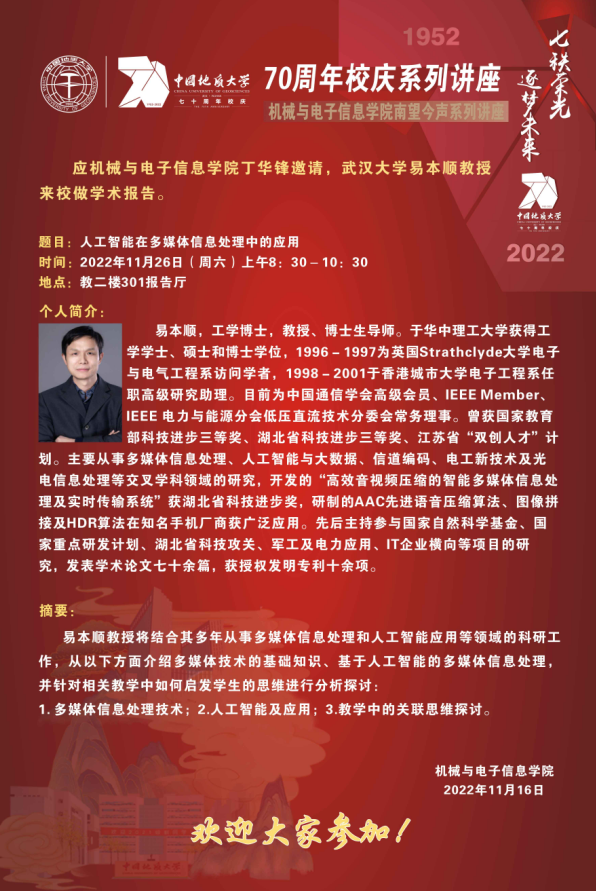 【11月26日】校庆系列学术活动---机电讲坛(2022-31):武汉大学易本顺教授