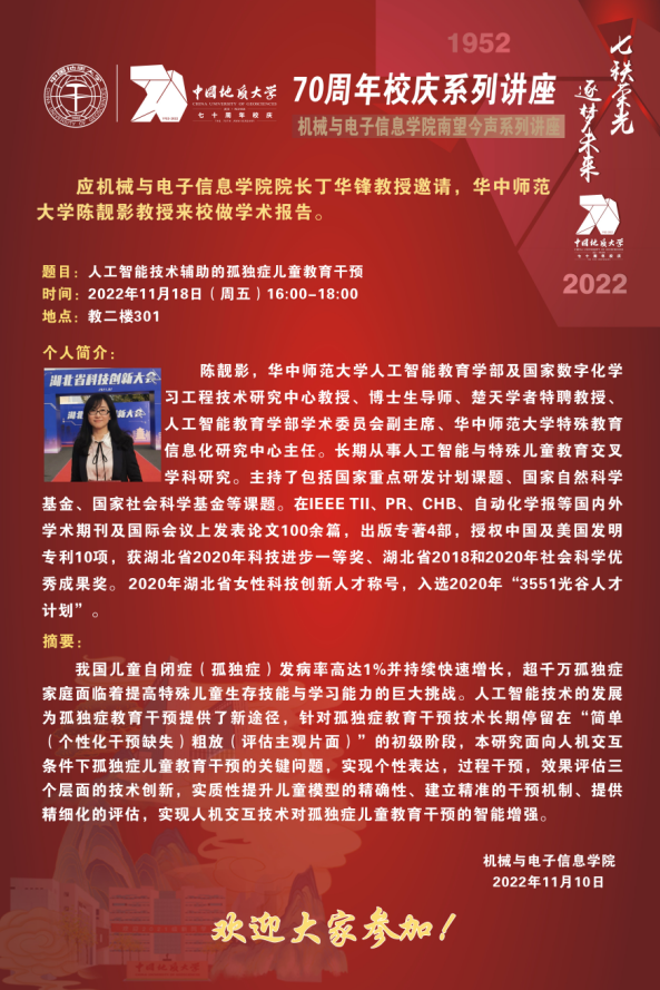 【11月18日】校庆系列学术活动---机电讲坛(2022-26):华中师范大学陈靓影教授