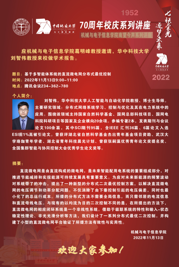 【11月13日】校庆系列学术活动---机电讲坛(2022-27):华中科技大学刘智伟教授