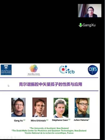 徐刚博士的报告深入浅出,对克尔谐振腔中矢量孤子的性质与应用进行了非常专业的介绍,带来了最新的学术资讯。