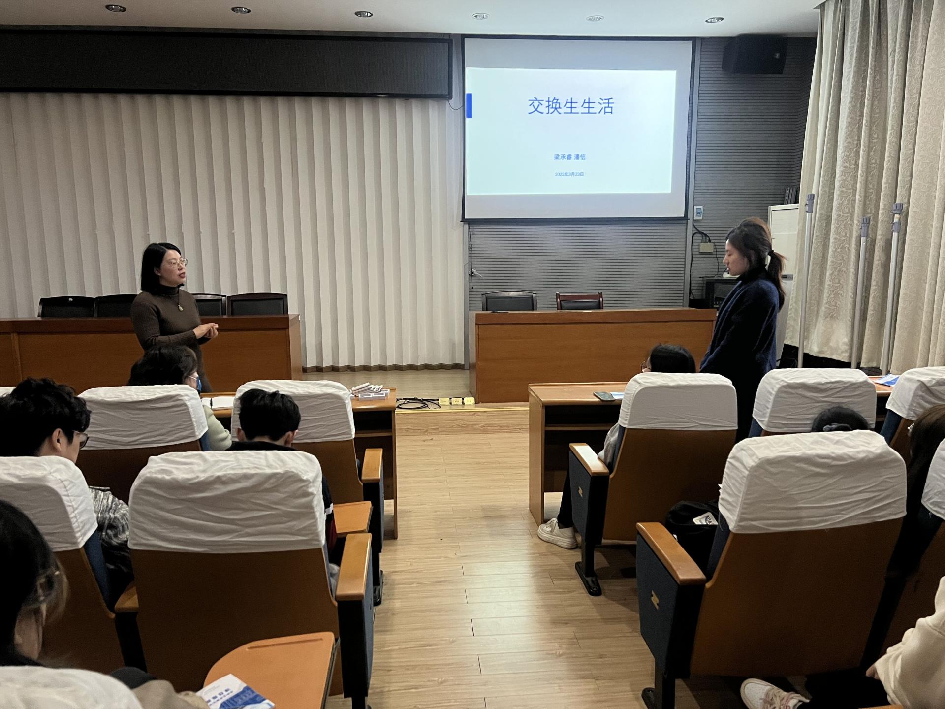 最后,曾经参加过韩国汉阳大学交换生项目的我院梁承睿和潘信同学为大家分享了在汉阳大学交换学习的点点滴滴。作为学长,他们分享了在韩国的学习、考试、生活、当地文化体验,还为学弟学妹们制作了申请策略,提供了参加国际交流的时间规划参考。梁承睿同学还为大家分享了自己制作的视频,他用精彩的短片记录了自己的交换生生活和韩国济州岛之行,并鼓励学弟学妹们只要想出国,不要害怕,勇敢迈出第一步。