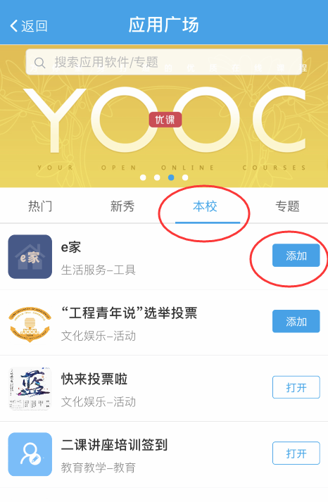 c.择本校,添加“e家”轻应用并进入