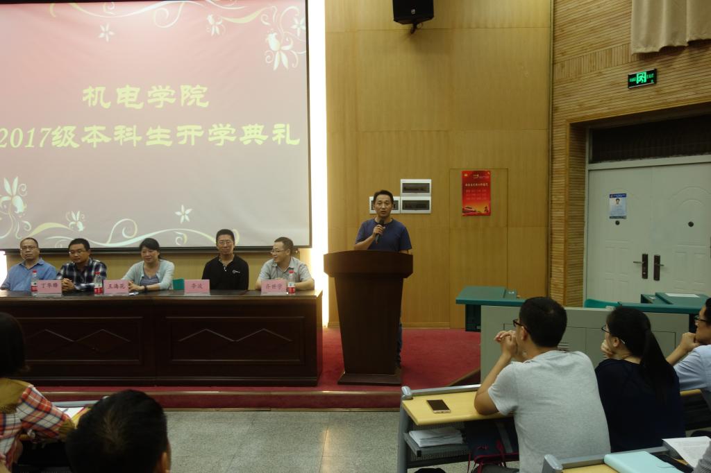 9月6日晚,机电学院2017级本科生开学典礼在教三楼109举行。院党委书记王海花、院长丁华锋、副院长李波、黄田野、罗杰、院党委副书记齐世学、教师代表郝国成出席典礼。