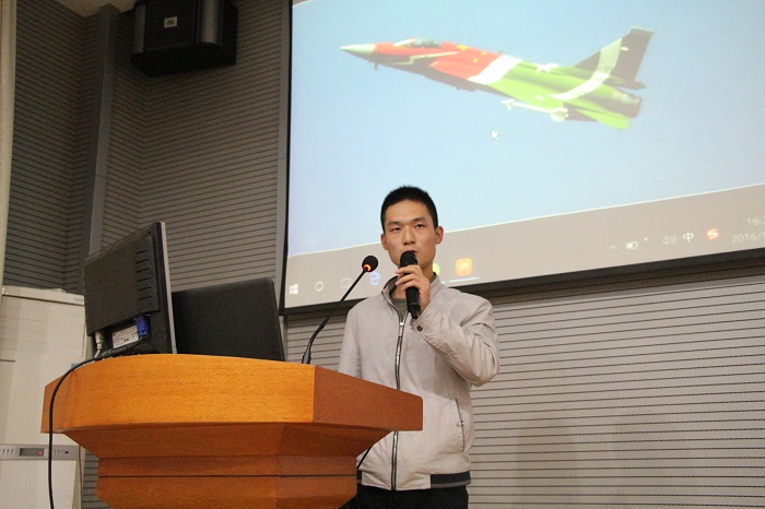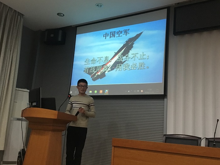 本次论坛以“中国空军‘长征路’”为主题,按时间顺序回顾了中国空军自建国以来历代战斗机的发展历程。首先,国防生协会会长张宜达致开幕词:奋武义扬,披坚执锐少年郎;保家卫国,以铁作血戎边疆。随后四位主讲人依次登台演讲。建国初期,我国国防力量相对薄弱,为应对此种境况,中国空军应运而生。第一位主讲人吴迪为大家讲解了中国空军第一代战机的发展史,她从歼-5的引入和发展来向大家介绍了中国空军的艰难启程。随着美军战机进入超音时代,我国空军也开始“蹒跚学步”。第二位主讲人朱寅斌向大家展示了空军的第二代战机——歼7和歼8,他分别从战机主要功能和改进方向向大家详细介绍了我国第二代战机的特点——高空高速。上世纪末,现代战争发展为信息化,电子化战争。为了维护我国的制空权,我国开始了第三代战机——歼10与歼11的研制。第三位主讲人包程以苏联的“苏-27”为引,展开了对我国第三代战机的介绍。他指出我国第三代战机的特点就是“低空突防能力强、续航高和载弹量大”。随着科技的进步,战机的性能也越来越强。世界战机也逐渐进入了“4‘s’时代”,即隐形能力、超音速巡航能力、超机动能力、超级信息优势。第四位主讲人王新立以珠海航展上惊鸿一现的歼-20为切入点,着重向大家介绍了我国第四代战机优异的作战性能。四位主讲人深入浅出的讲解、生动活泼的演示频频引发观众们的掌声。演讲期间,他们还与场下的观众热情互动,并为参与互动的观众送上了精美的礼物。
