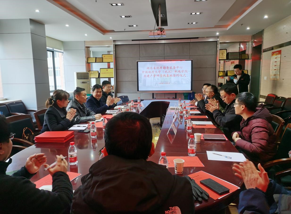 2020年12月21日下午2点,湖北省地质勘查装备中心党委书记任康进,带领中心副主任吴专、办公室主任杨梅、武汉探矿机械厂董事长李小标,就双方实验室共建、产学研基地落实等事宜,来我院交流并举行签约仪式。学院党委书记瞿祥华、机械系主任宋潮龙、机械系党支部书记韩光超、机械系副主任梅爽、实验中心主任赵权、办公室主任李昌平以及机械系教师吴来杰、程斯一、贺鑫等老师参与了座谈交流,会议由副院长文国军教授主持。