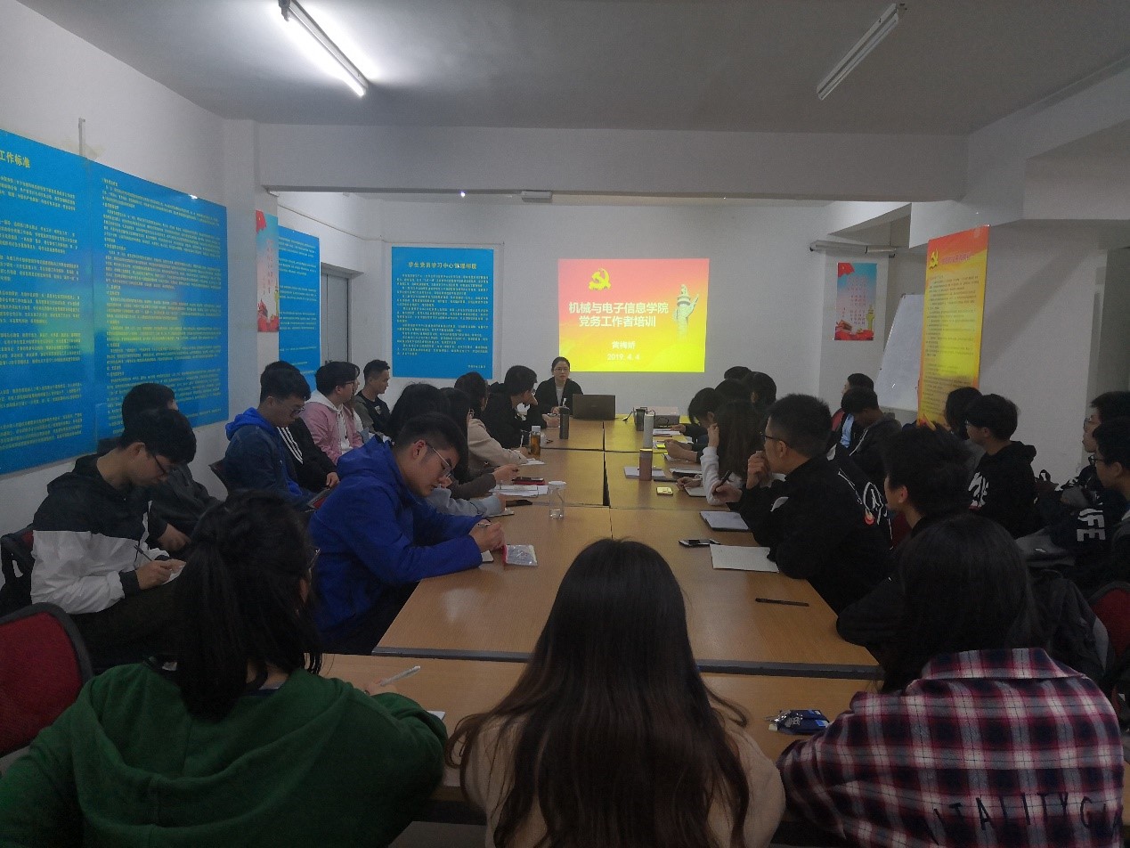 (通讯员 陈曦 张晓庆 王润翔)4月4日下午2:30,我院在63#学习支持中心7号学习室开展学生党务工作者培训会。参加本次培训的有学院本科生党支部书记及支委成员、2018级研究生党支部书记及支委成员、学生党建办公室工作人员。学院党建辅导员、学生党建办公室主任黄梅娇担任培训主讲,此次培训主题为“学生党员发展及转正工作流程及注意事项”。