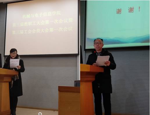 (机电学院工会高翟)2018年12月20日下午,机械与电子信息学院(以下简称机电学院)第三届教职工大会第一次会议暨第三届工会会员大会第一次会议在教二楼301会堂隆重召开。校工会于荣萍副主席及机电学院全体教职工与会,会议由机电学院党委副书记于晓舟同志主持。