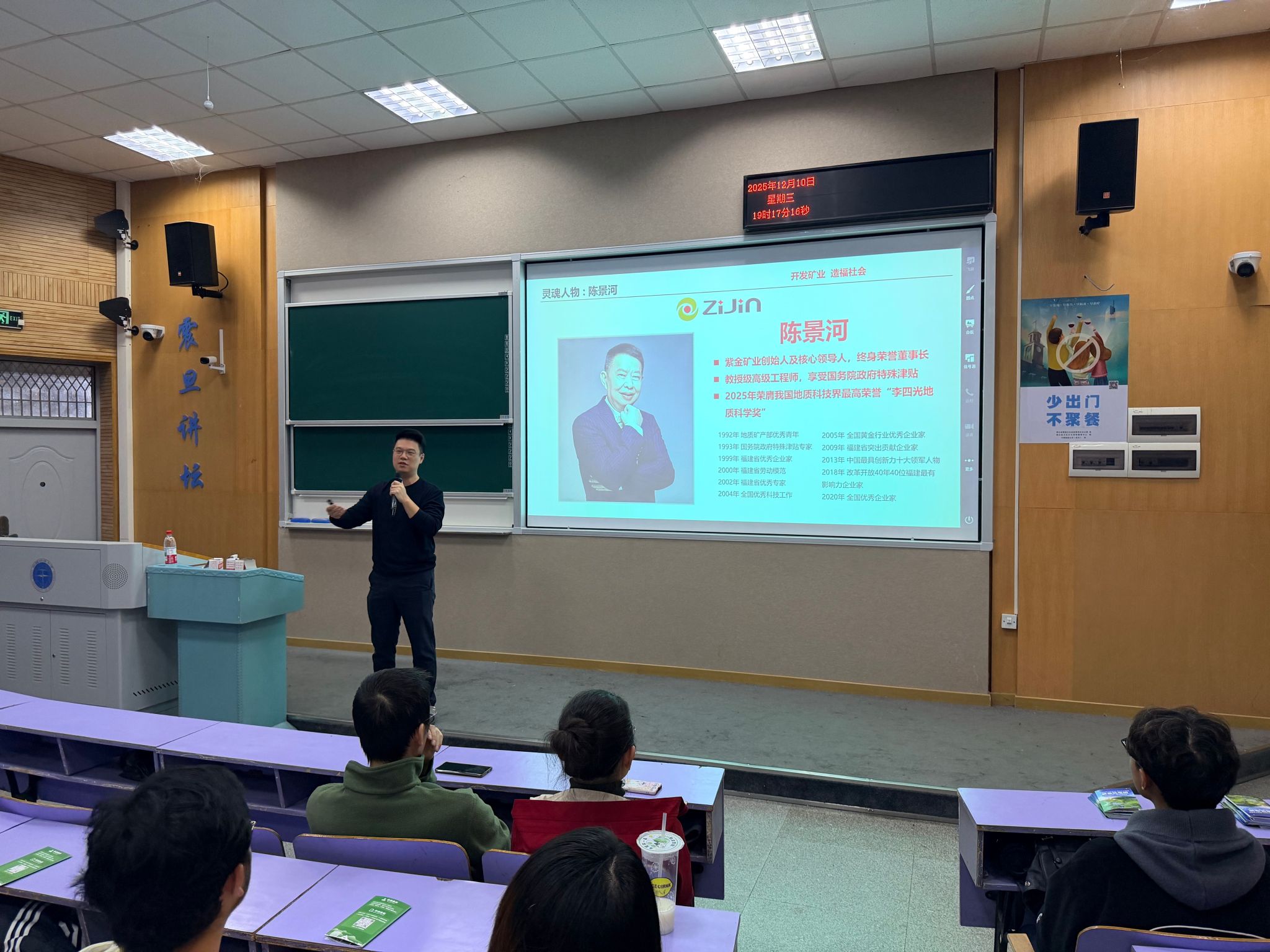 12月10日晚,学院成功举办第二期“紫金机电班”招生宣讲会。紫金矿业集团招聘处处长舒勃、培训处处长林晞,学院副院长王勇、党委副书记吴迪,以及2024级全体本科生参加了本次宣讲会。会议由2024级辅导员刘彪主持。