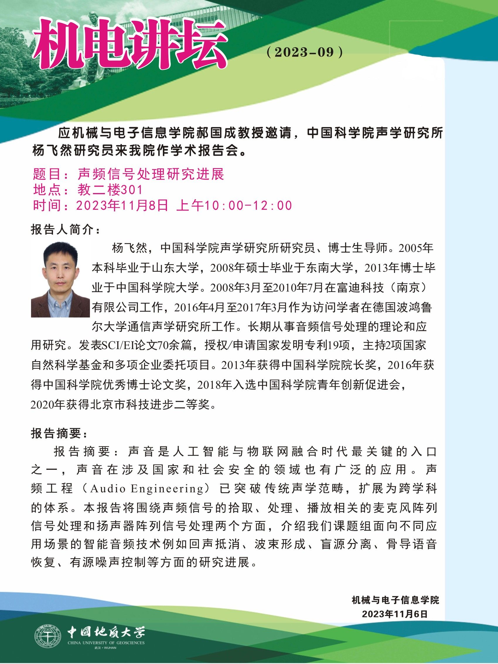 【11月8日】机电讲坛(2023-9):中国科学院声学研究所杨飞然研究员来我院作学术报告会