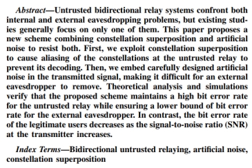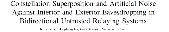 近日,机械与电子信息学院通信系2022级本科生赵家伟以第一作者在IEEE国际知名期刊IEEE Wireless Communications Letters发表题为“Constellation Superposition and Artificial Noise Against Interior and Exterior Eavesdropping in Bidirectional Untrusted Relaying Systems”的学术论文。该论文提出了基于人工噪声的星座叠加技术,为双向中继系统对抗来自内部和外部的非法窃听提供了创新性解决方案。论文的指导教师为通信系特任副教授贺宏亮。