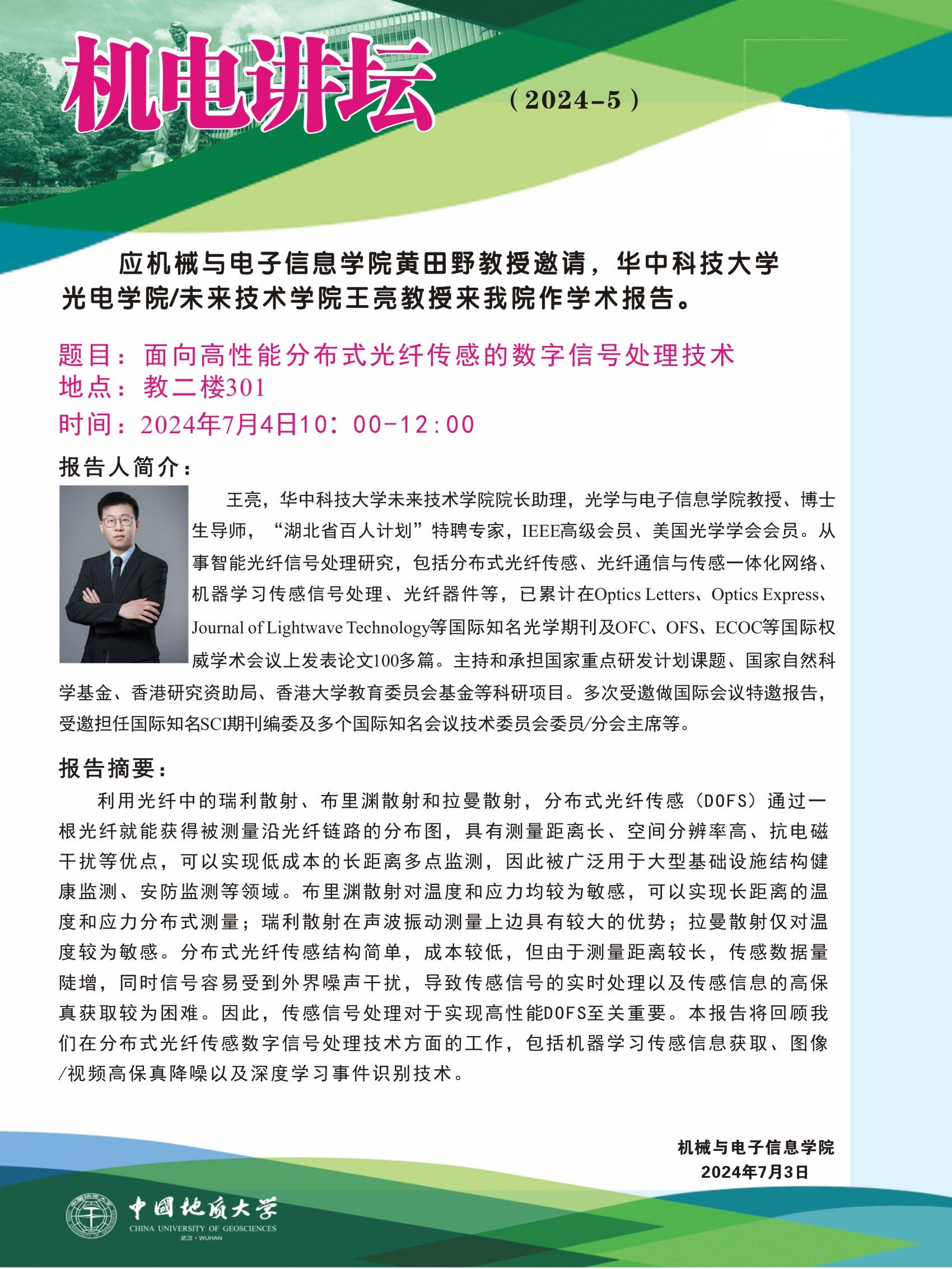 【7月4日】机电讲坛(2024-5):华中科技大学未来技术学院王亮教授来我院作学术报告会