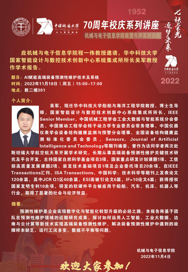 【11月18日】校庆系列学术活动---机电讲坛(2022-25):华中科技大学吴军教授