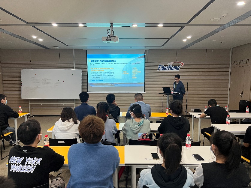 首先,烽火通信公共研发部副总经理陈晓武,介绍了公司的发展历程、近年来企业技术发展与未来发展方向,结合新工科专业特点,为同学们讲述专业与新技术、新产业、新业态相融合。鼓励同学们投身实践,结合个人优势,保持科研追逐与热情,在实现个人目标的同时,为民族产业创新而努力。