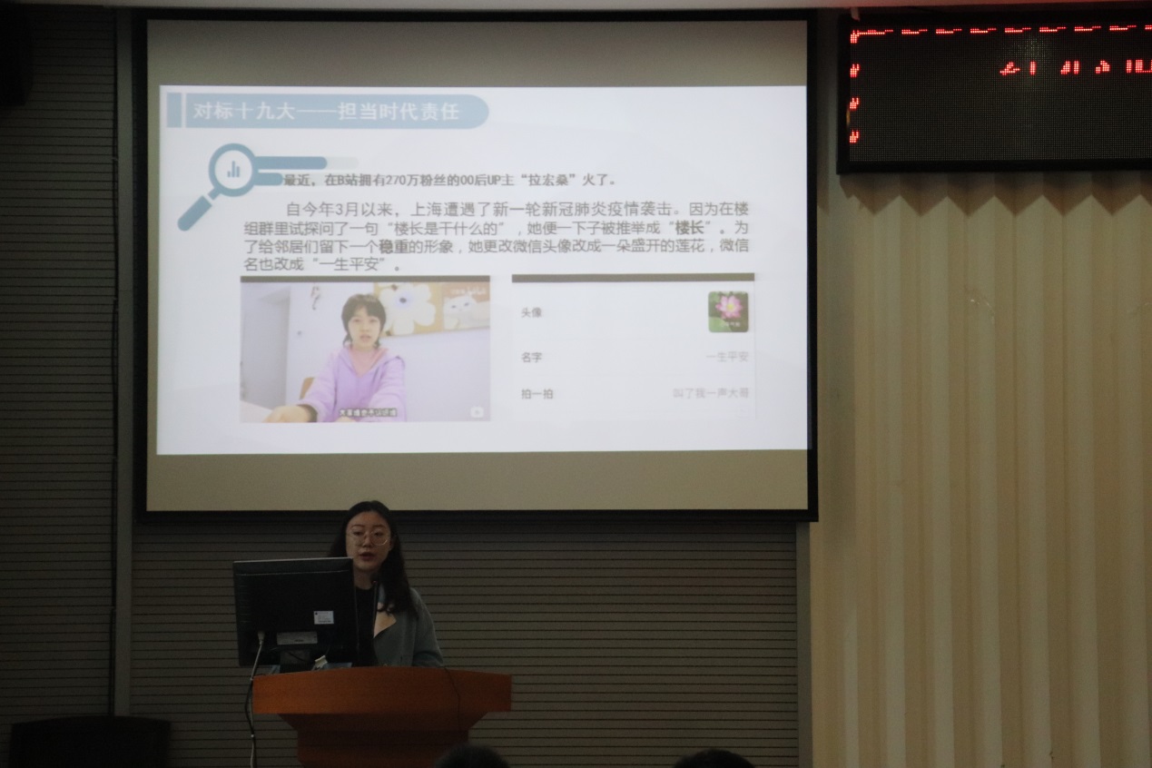 比赛过程中,各学生党支部书记围绕“迎接党的二十大、党支部的职能作用发挥、学生党员的职责和使命、党史学习教育、坚定文化自信、我国民法典的发展历程、新时代青年的使命担当”等方面讲授专题党课。其中,部分党支部书记将身边事例融入到党课讲述过程中,通过现身说法有效增强党课的吸引力和感染力,赢得现场观众阵阵掌声。