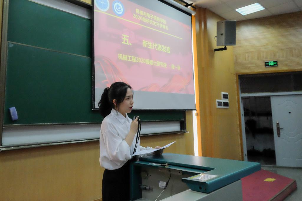新生代表、机械专业2020级硕士研究生庞一菲发言。她分享了自己本科四年的多彩经历和读研初心,并代表全体新同学承诺,将坚守初心、勇于创新、保持恒心,争做新时代的建设者、开拓者和实践者。