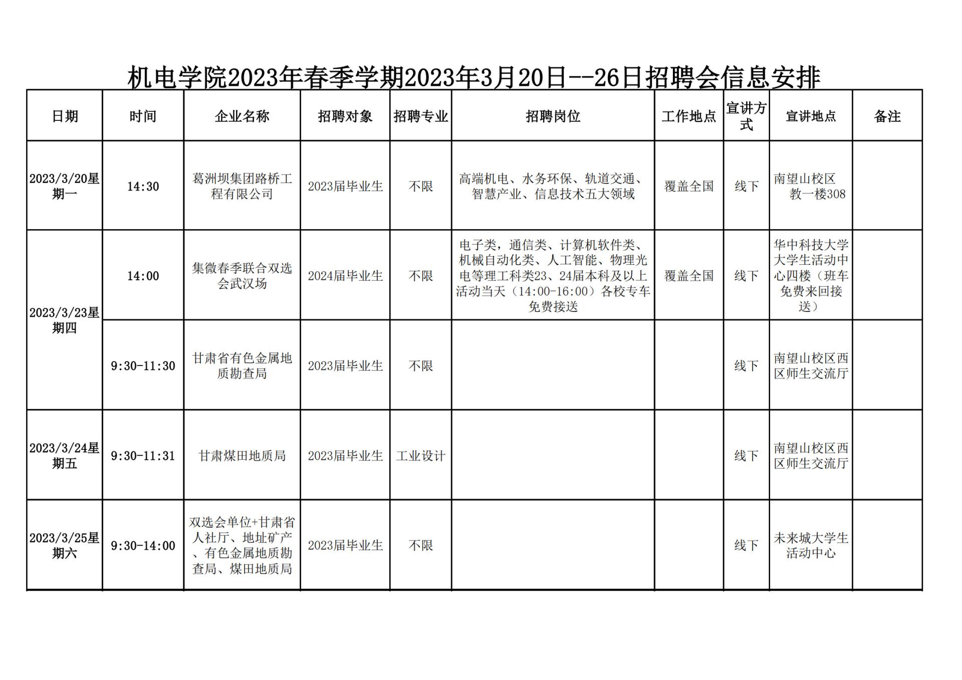 【毕业生·2023年3月13日--18日招聘会信息】机电学院2023年春季学期2023年3月13日--18日招聘会信息安排
