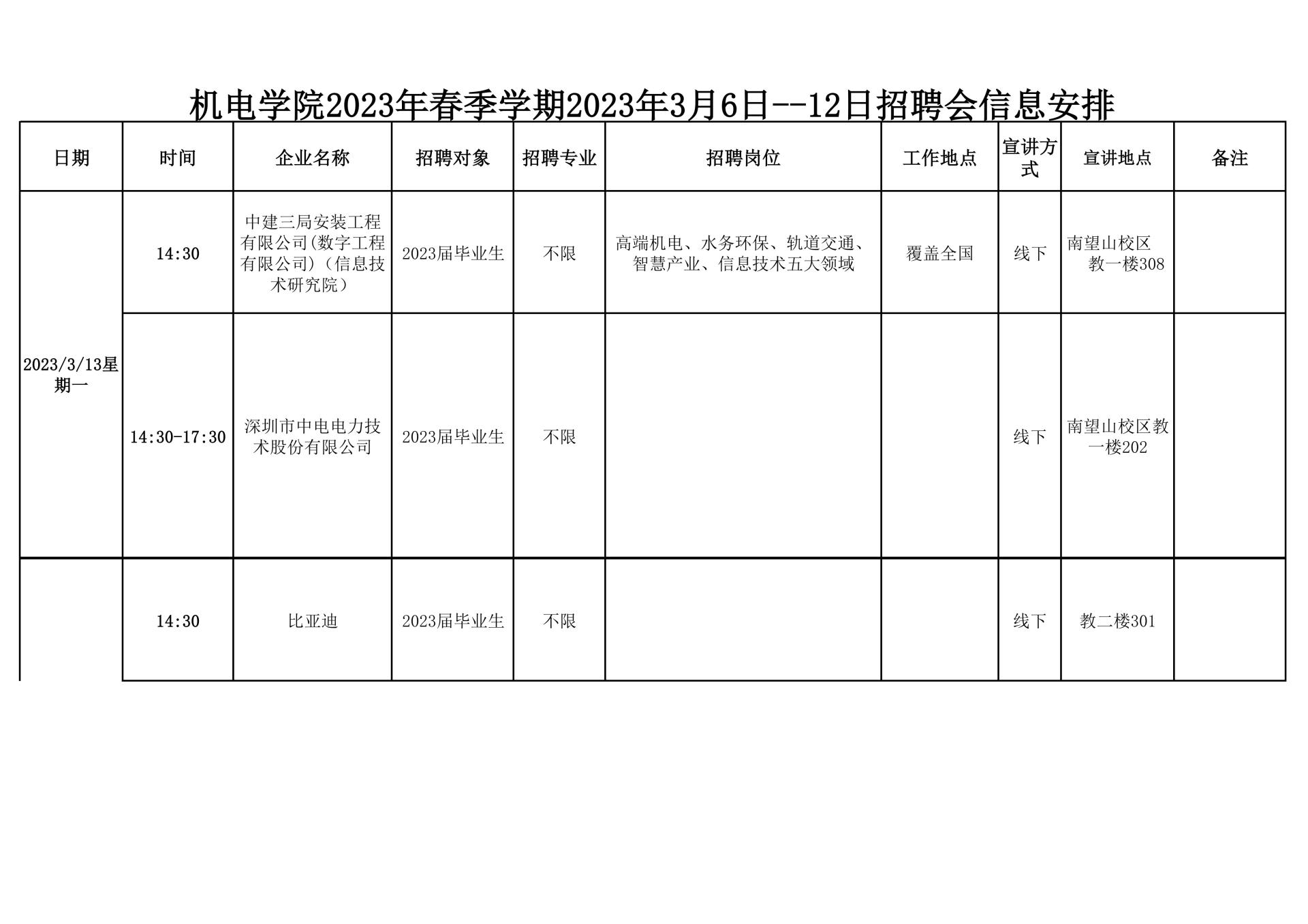 【毕业生·2023年3月13日--18日招聘会信息】机电学院2023年春季学期2023年3月13日--18日招聘会信息安排